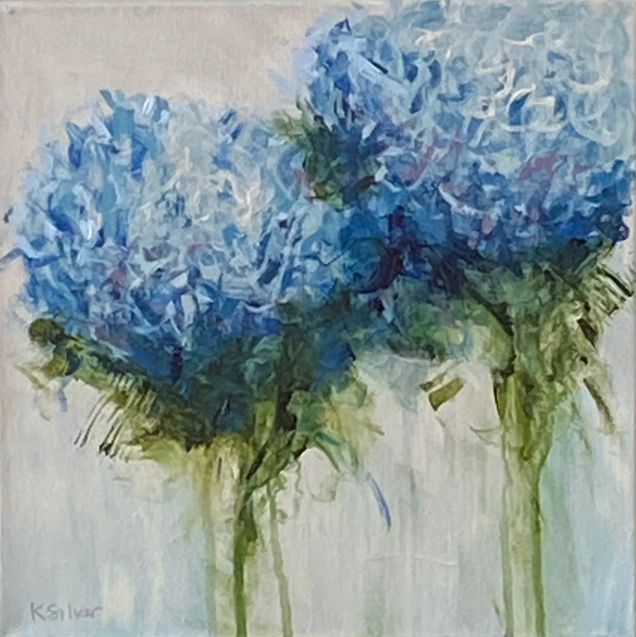 BLUE BLOOMS IV | Acrylic on canvas. This piece measures 12" h x 12" w. This piece is finished edge, and is hang-ready. It does not require additional framing.