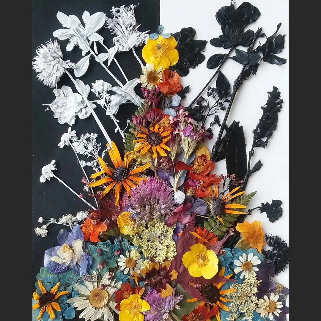 Mixed Media of water colors, spray paint, assemblaged flowers and humanely collected monarch butterflies. 10" h x 10" w. Frame Inclusive.